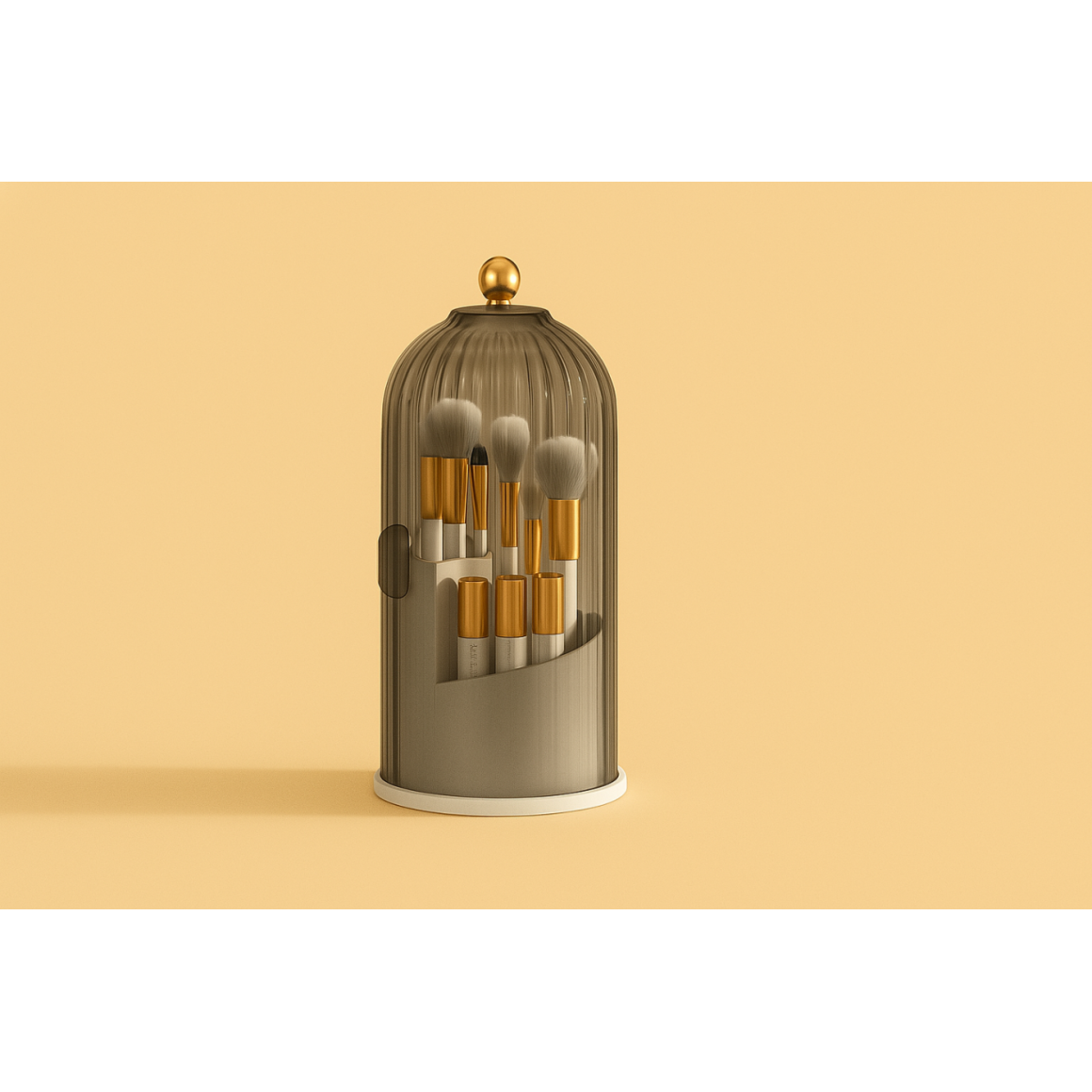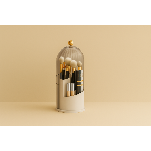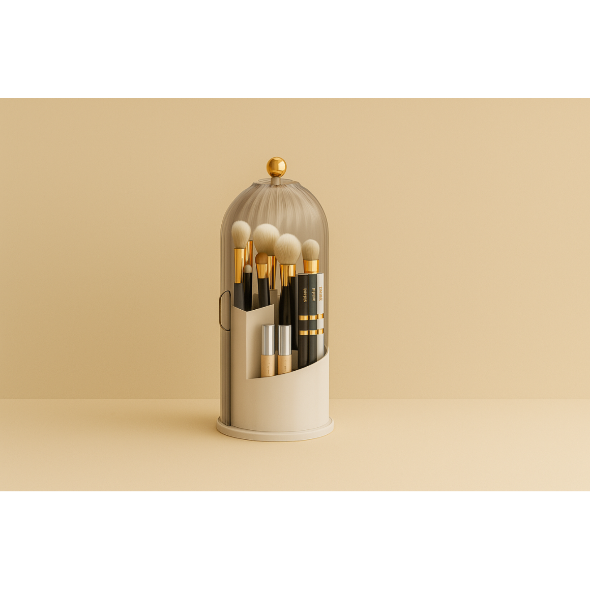 Mantenha seus pincéis, maquiagens e acessórios sempre organizados com este elegante Organizador de Maquiagem Rotativo. Com design moderno e funcional, ele possui compartimentos internos bem distribuídos e uma cúpula protetora que protege contra poeira, mantendo seus itens limpos por muito mais tempo.