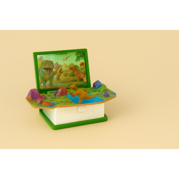 Design em formato de livro com temática de dinossauros.