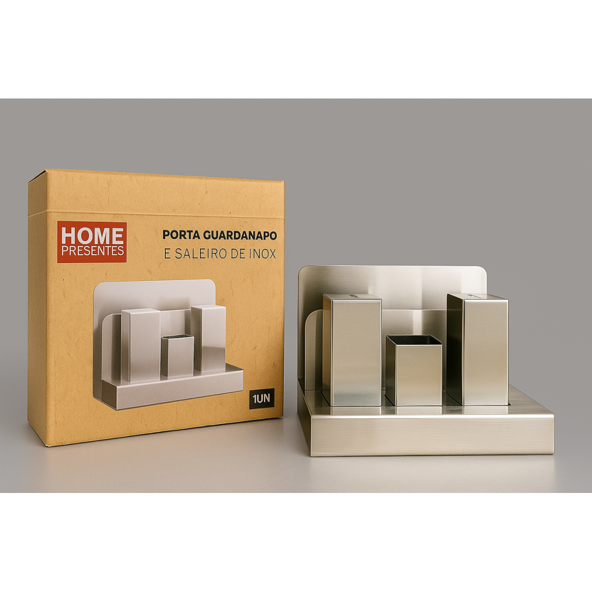 Jogo de Saleiros em Inox Escovado – elegante e funcional, ideal para servir sal e pimenta à mesa com praticidade e estilo.