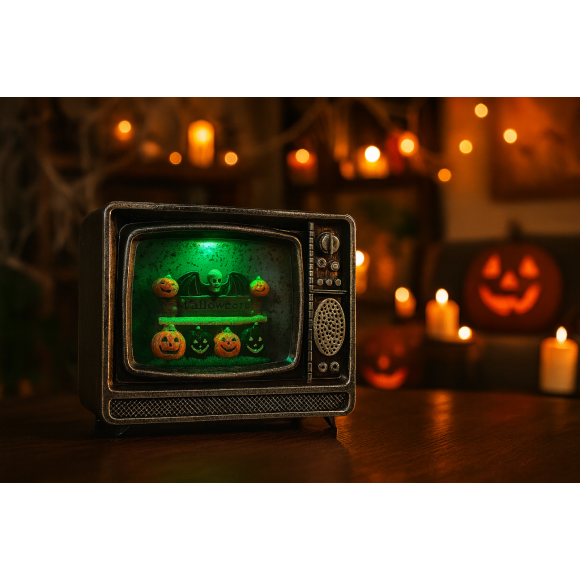 Design exclusivo em formato de TV antiga com cenas de Halloween