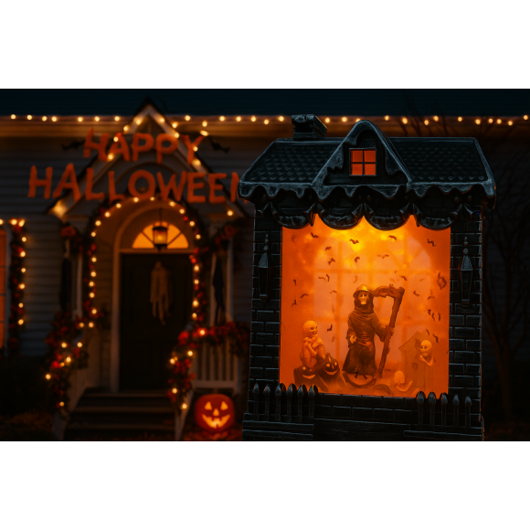 Casa Assombrada Decorativa – tema Halloween, perfeita para criar uma atmosfera assustadora e divertida na sua decoração temática.