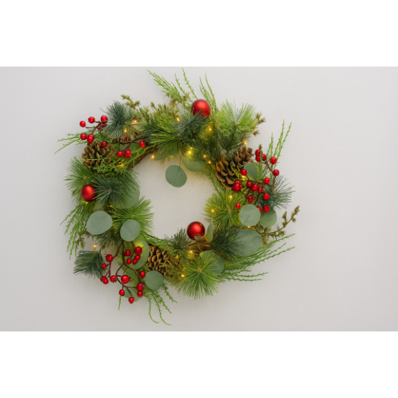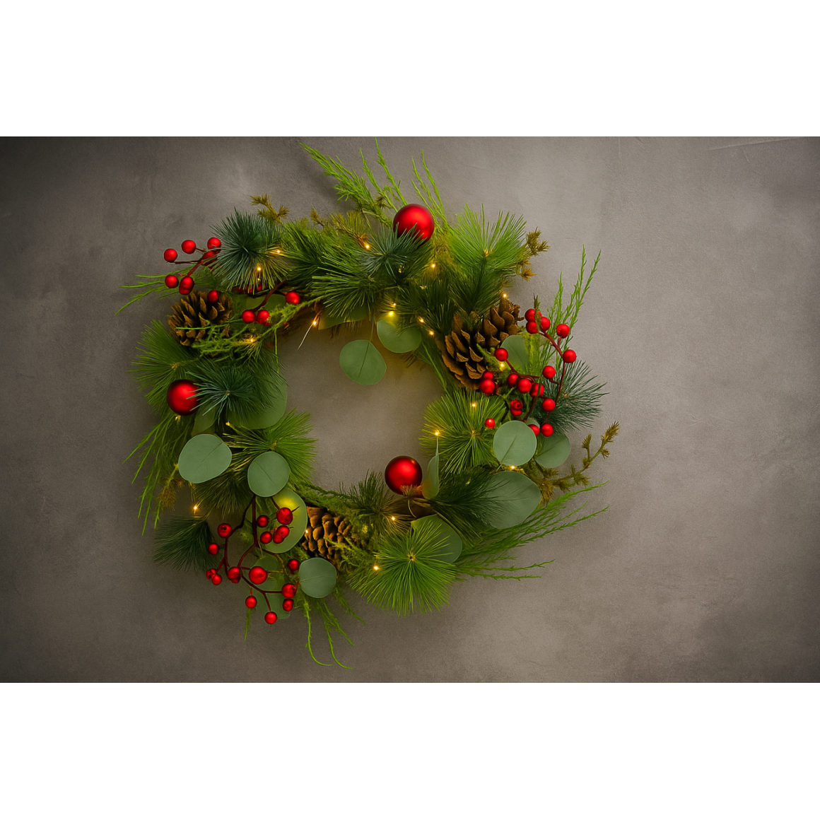 Guirlanda Natalina – modelo clássico e elegante, ideal para compor a decoração de portas, janelas ou paredes, trazendo charme e aconchego para o ambiente.