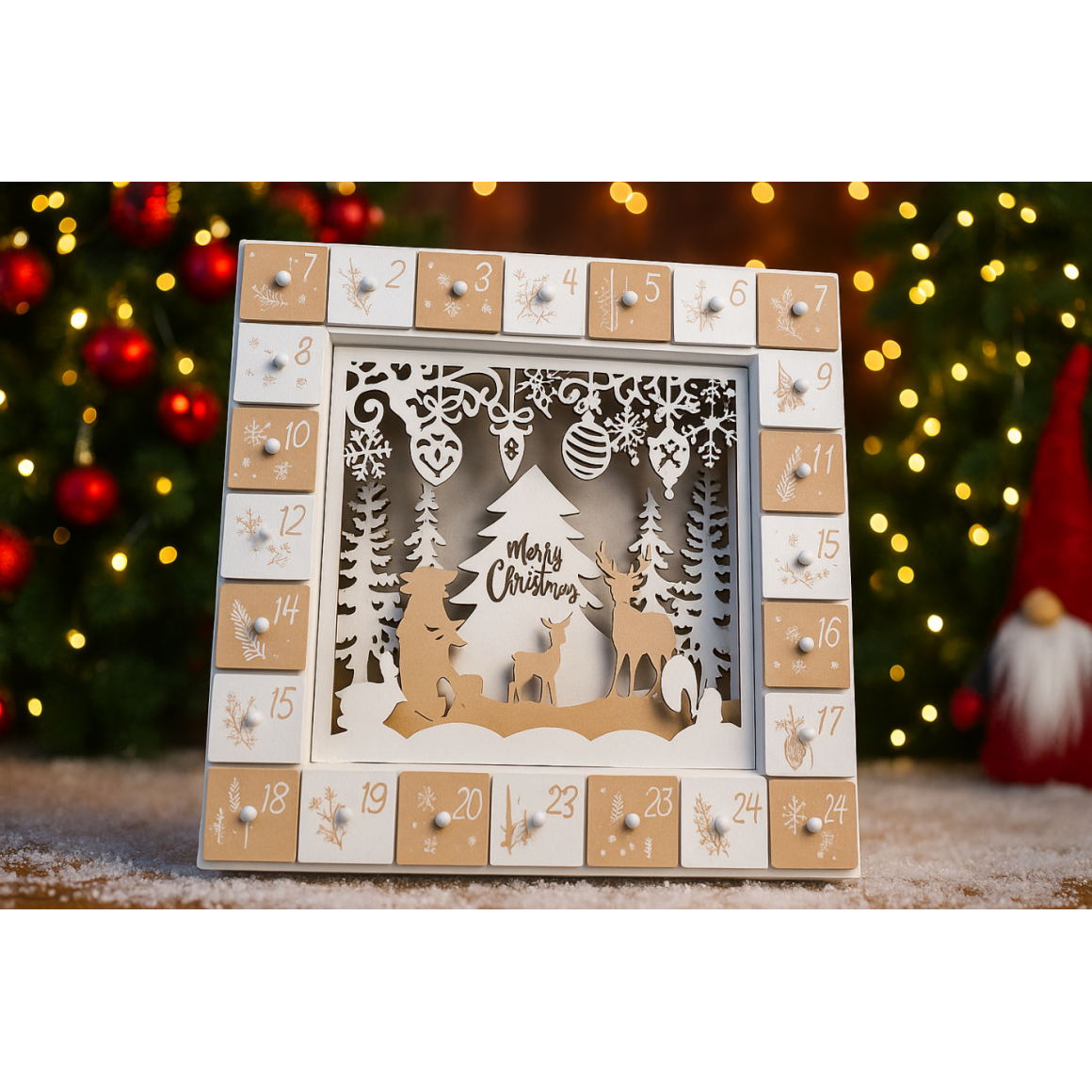 Calendário Advento de Natal em Madeira com LED – peça decorativa charmosa e funcional, perfeita para contar os dias até o Natal e trazer ainda mais encanto para a decoração.