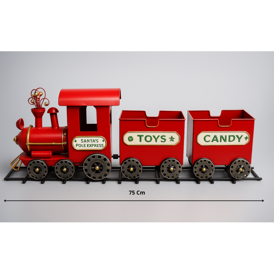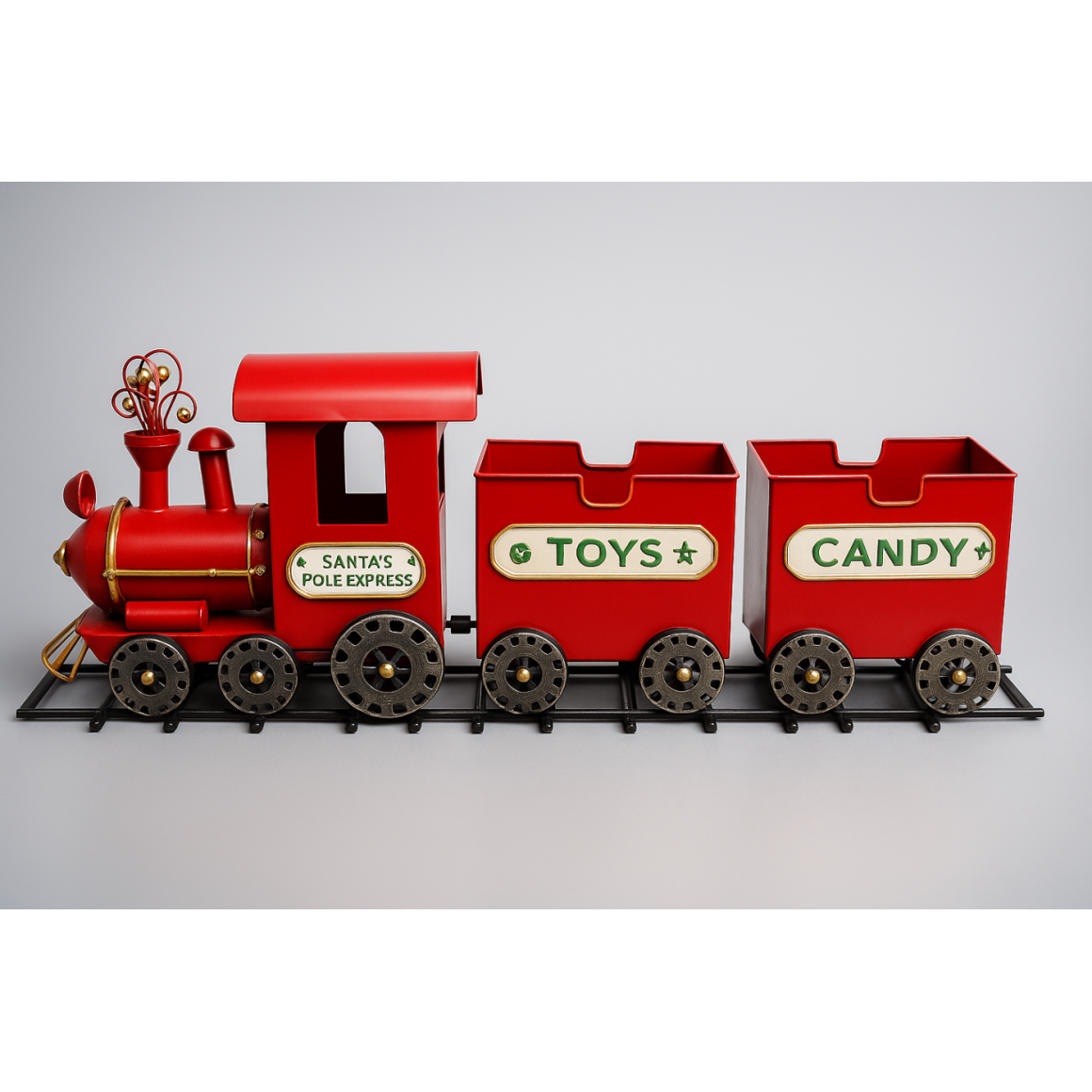 Trem Natalino de Metal – enfeite imponente e sofisticado, perfeito para destacar a decoração natalina e encantar crianças e adultos.