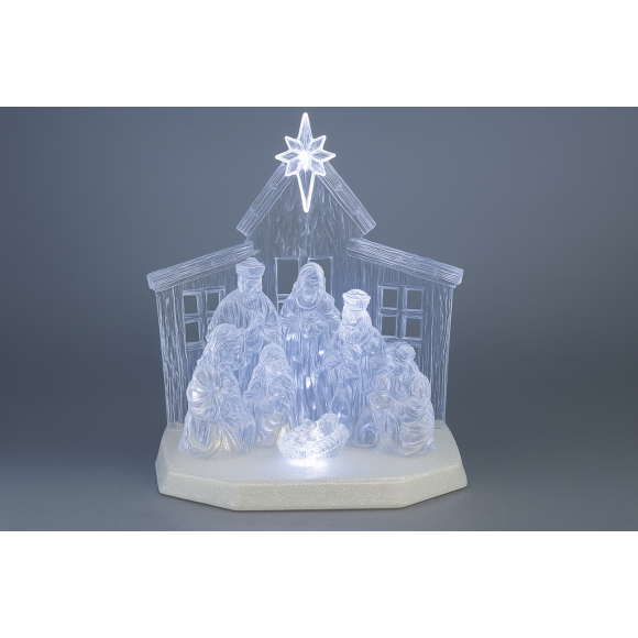 Enfeite Presépio de Gelo 23cm, uma peça delicada que representa a cena do nascimento de Jesus com um acabamento translúcido que remete ao gelo, trazendo beleza, espiritualidade e sofisticação para sua decoração natalina.