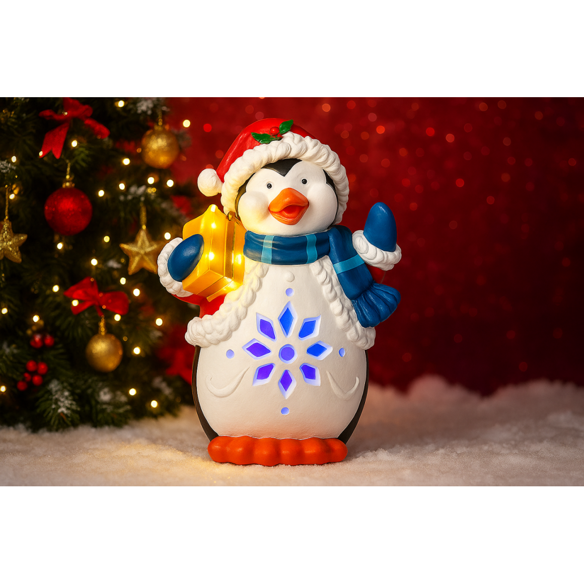 Enfeite Pinguim Natalino Musical USB, uma peça encantadora que une fofura e tecnologia. Além de decorar, o pinguim reproduz músicas natalinas, criando uma atmosfera alegre e festiva em qualquer ambiente.