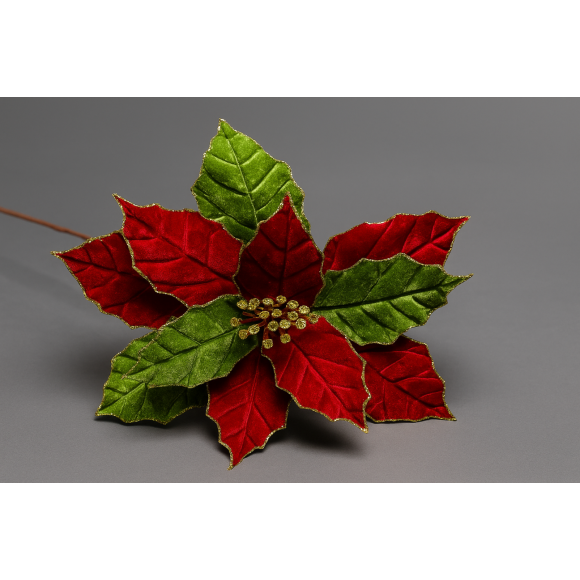 Esse modelo é bem elegante, com pétalas em vermelho e verde, acabamento em brilho dourado, ideal para enfeitar guirlandas, árvores, arranjos ou até mesas de Natal.