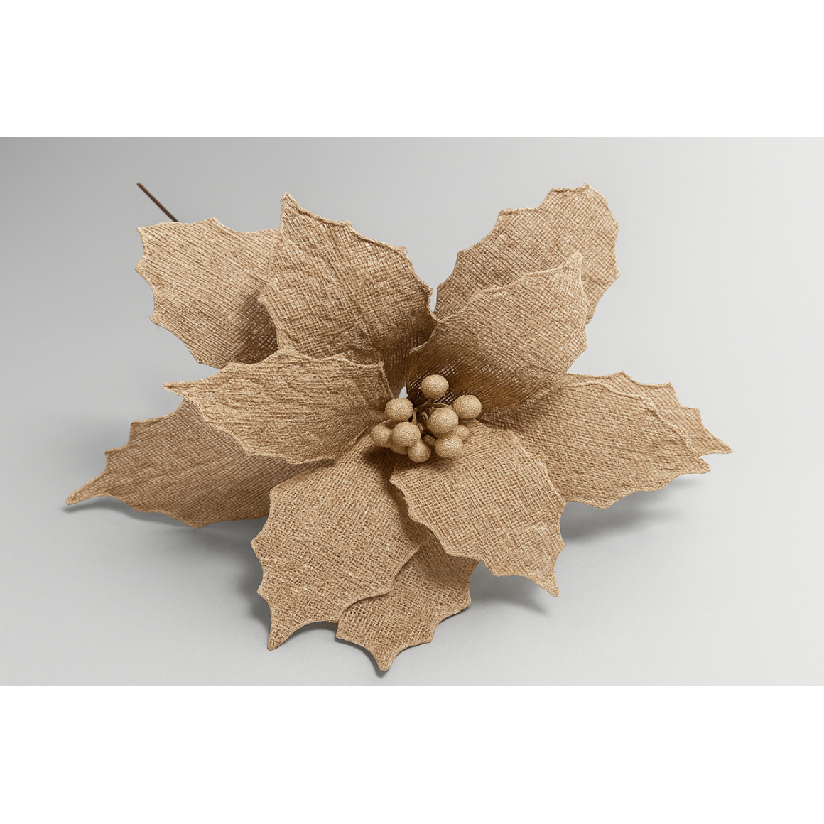 Flor decorativa natalina estilo bico de papagaio, confeccionada em tecido juta, com acabamento rústico elegante e bolinhas decorativas no centro.