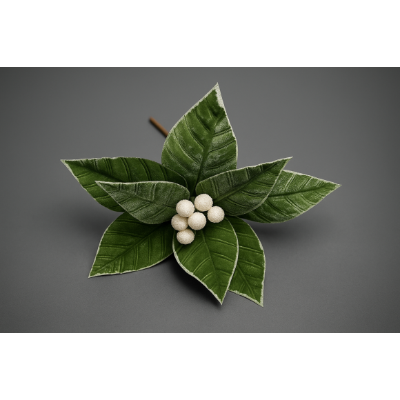 Produzida em tecido aveludado de alta qualidade, sua coloração verde intensa contrasta lindamente com as bordas brancas, que remetem à neve natalina. No centro, a flor conta com bolinhas decorativas brancas, criando um detalhe elegante e diferenciado que valoriza ainda mais a peça.