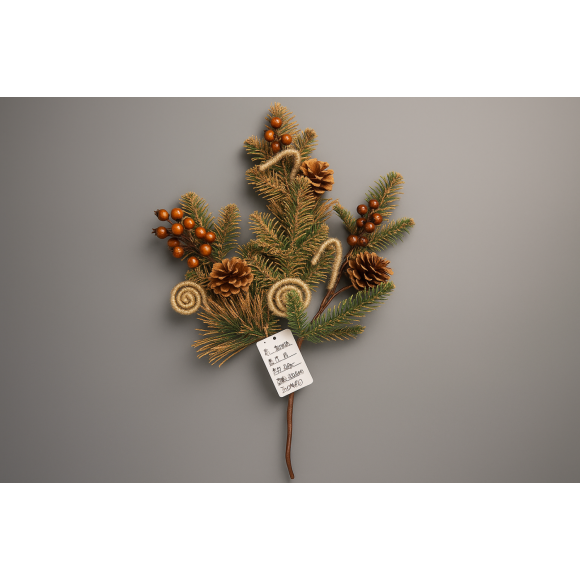 Traga o encanto rústico do Natal para sua decoração com este pick natalino de 60cm, elaborado com riqueza de detalhes que remetem ao clima acolhedor das festas. O arranjo conta com ramagens verdes estilo pinho, acompanhadas de frutinhos marrons, pinhas naturais e elementos decorativos que remetem a nozes e espirais artesanais.
