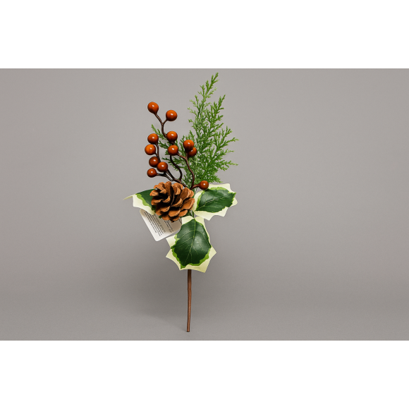 O galho é composto por frutinhos vermelhos brilhantes, que trazem o contraste perfeito com as folhas verdes realistas, além de uma pinhas naturais que reforçam o charme rústico e acolhedor do Natal. O caule maleável permite fácil fixação em diferentes composições, proporcionando versatilidade e praticidade na hora de decorar.