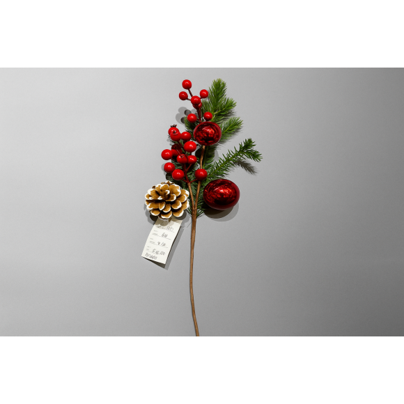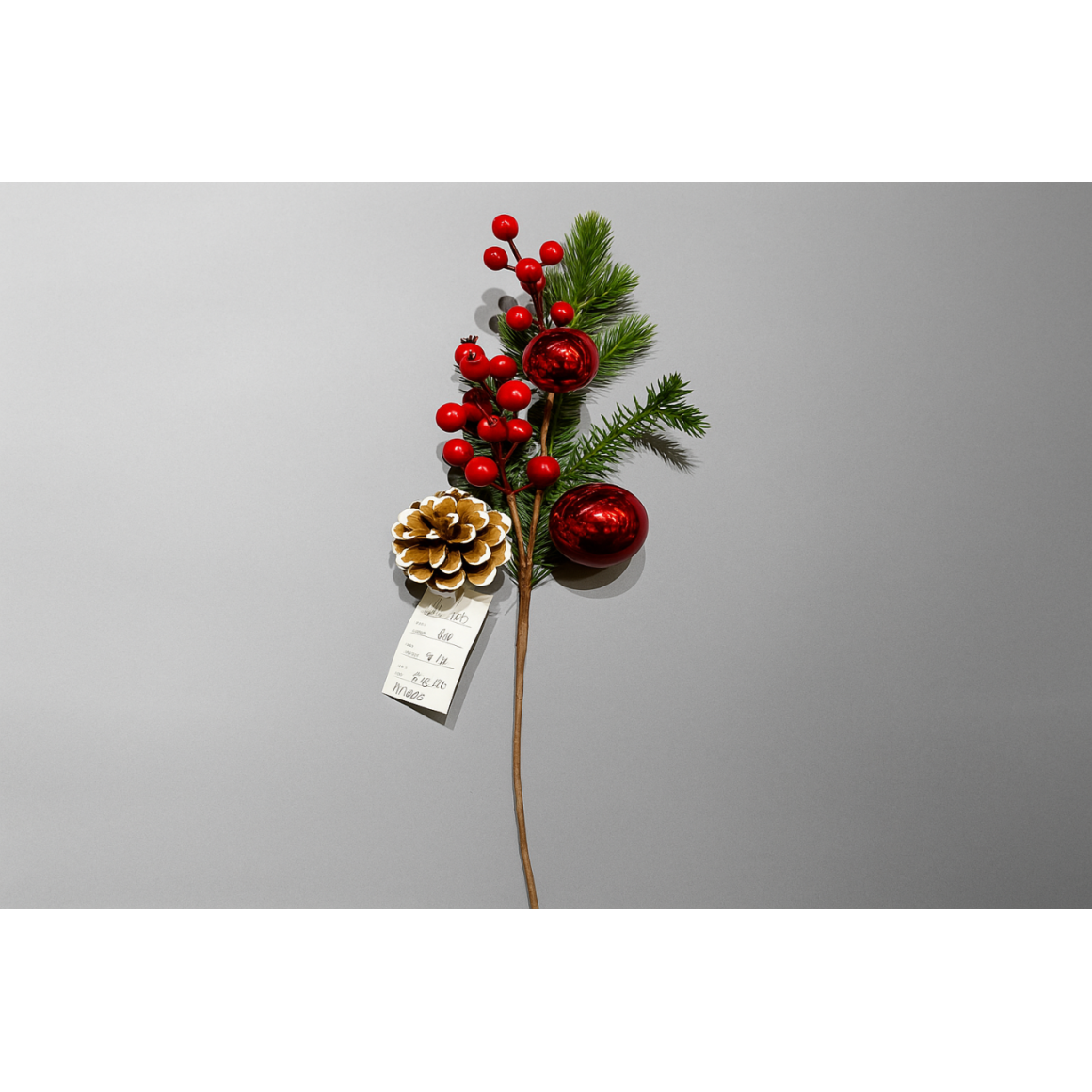 O ramo também conta com folhagens verdes em estilo pinheiro, trazendo um toque natural que realça ainda mais a composição. Perfeito para ser usado como complemento em guirlandas, árvores de Natal, arranjos de mesa ou decorações em vasos, oferecendo um visual sofisticado e harmonioso.