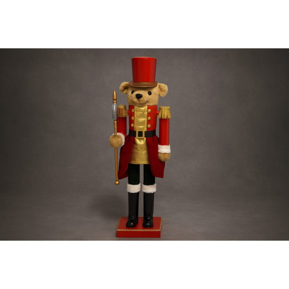 Com design imponente e acabamento rico em detalhes, o modelo em formato de urso soldado veste uniforme clássico em vermelho e dourado, com ombreiras decoradas, botas pretas e chapéu alto, trazendo charme e elegância para qualquer ambiente.