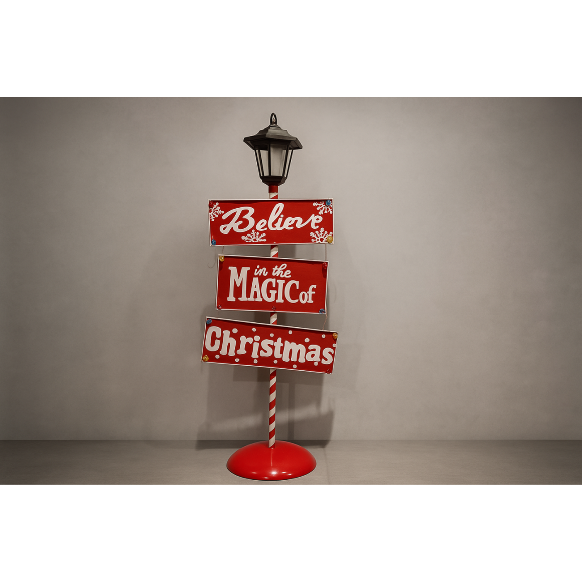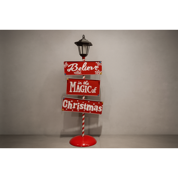 Composto por uma estrutura metálica resistente e pintada nas cores tradicionais do Natal, o poste apresenta três placas decorativas com dizeres em inglês — “Believe in the Magic of Christmas” — em um belo acabamento vermelho com letras brancas e detalhes de flocos de neve. No topo, há uma lanterna decorativa que adiciona um toque acolhedor e elegante, remetendo ao charme das ruas natalinas iluminadas.