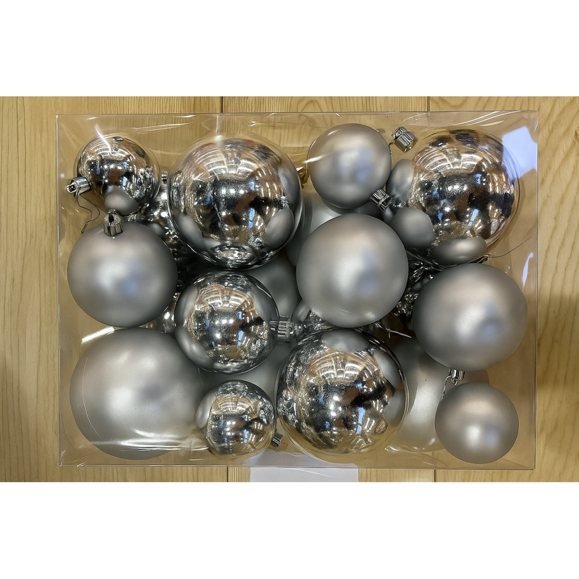 As bolas vêm em uma paleta sofisticada de prata, com acabamentos fosco e brilhante, criando um contraste refinado que reflete as luzes e dá um toque moderno à composição natalina.