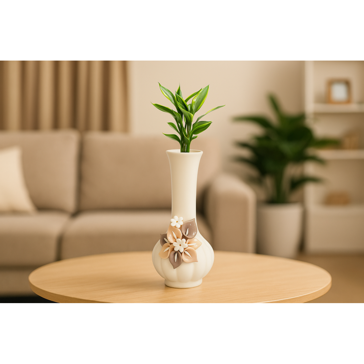 O Vaso de Porcelana Branco 7x15cm é uma peça elegante e delicada, ideal para compor decorações com um toque de charme e sofisticação. Seu design curvado e os detalhes florais em tons neutros (branco, bege e marrom) proporcionam um visual romântico e moderno ao mesmo tempo, combinando com diversos estilos de ambiente.