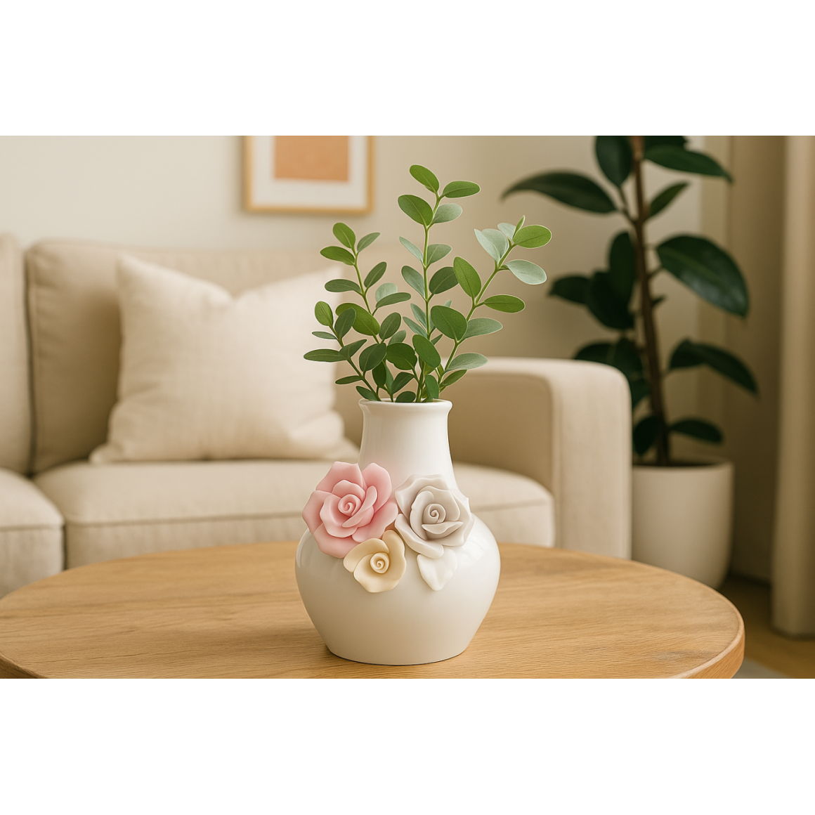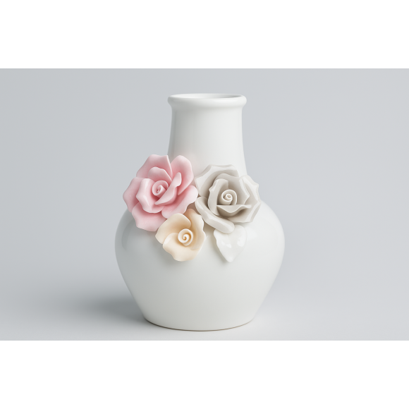 O Vaso de Porcelana Branco 9x15cm é uma peça sofisticada e encantadora, ideal para quem deseja trazer elegância e delicadeza à decoração. Feito em porcelana de alta qualidade, possui acabamento brilhante e flores em relevo artesanal nas cores rosa, bege e cinza, que adicionam um toque romântico e refinado ao ambiente.